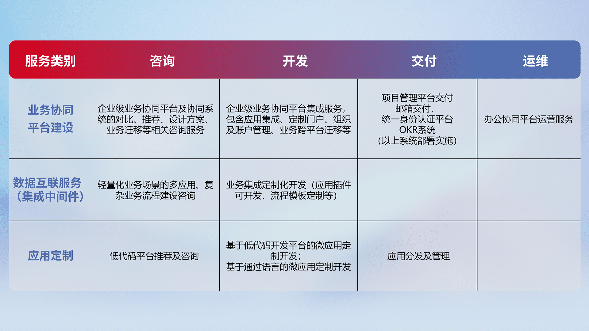 针对钉钉、、企微、、、、IDaas等平台级产品提供产品的规划、、方案、、、、交付、、、定制化开发等服务,,,实现如统一协同办公、、智能客户服务、、、、混合会议管理、、、、智能数据查询、、、等业务场景,,实现数字化转型。。
